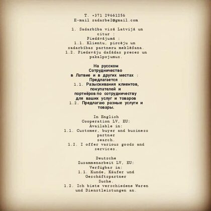 Ja konkrēta Interesē, tad zvaniet VAI rakstiet Nesadarbojamies Tikai, ja jusu Piedavajums kaut mazākā iespēja saņemt ar kautko nepiedienīgu VAI nelikumīgu , piem. erotiku, alkoholu u.tml ..