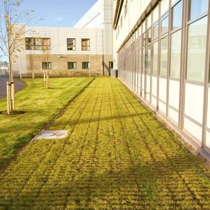 im Detail№ 11a. Pflasterfirma. Bodenaushub, Abtransport. Vorbereitung der Abdeckung. Pflasterung. Begrünung. Instalācija fon Zaunpfosten.